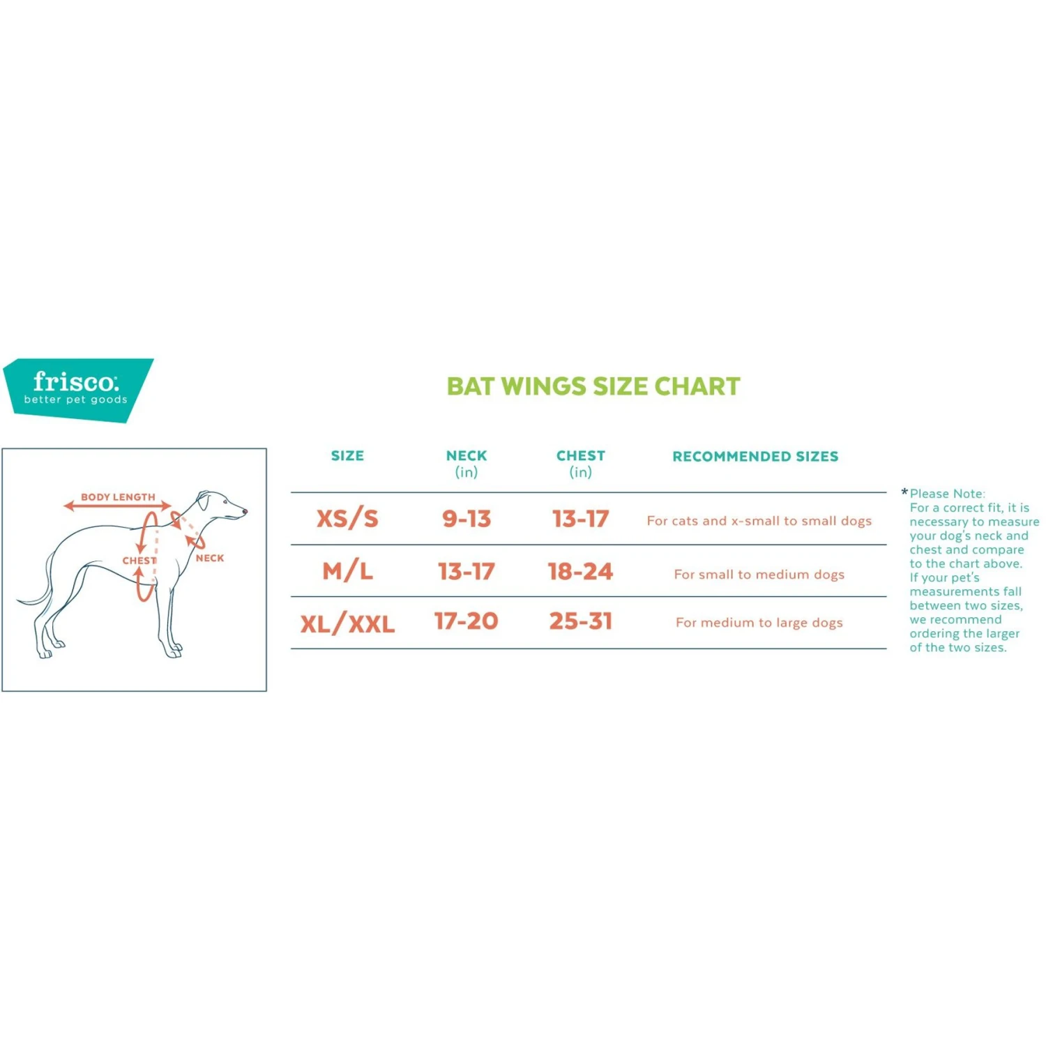 Frisco Bat Wings Dog & Cat Costume, X-Small/Small — Transform your pet from furry friend to creature of the night with the Frisco Bat Wings Dog & Cat Costume! This simple (and so cute) costume features felt and satin wings that stick out perfectly, with glittery accents for a little extra flash. It’s easy to put on, too, with hook-and-loop fasteners at the neck and belly that help them stay comfy while they’re in the spirit of the season. Whether you’re dressing for a party, a photo op or a trick-or-treat trot, these wings will send your pet soaring to the height of Halloween cuteness.